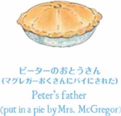 家のパソコンでピーターラビットのホームページを見ててピーターラビット&家族の紹介が載ってあったんですが…まぁピーターラビットはじめお母さんに兄弟は普通に紹介してあったんですがお父さんだけ…お父さんだけ…ピーターのお父さんと載ってあってその下に『マグレガーおばさんにパイにされた』と…パイになった画像と共に紹介されてて衝撃的でしたがな…
