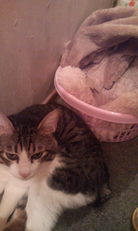 百円ショップでカゴを買ってきて家の近所にしまむらがあるのでしまむらでふかふかの小さい座布団と小さいタオルケットを買ってきて簡単なベッドを作ってやりました…